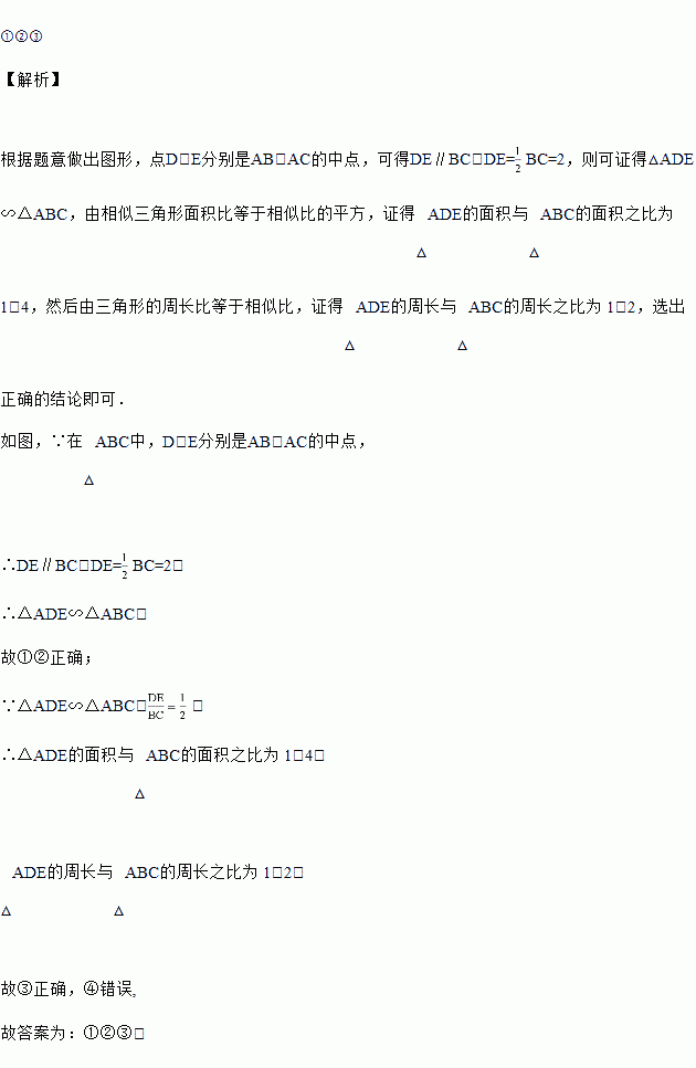中,、分别是边与的中点,,下面四个结论:①;②;③的面积与的面积之比为 ;④的周长与的周长之比为 ;其中正确的有________.(只填序号)