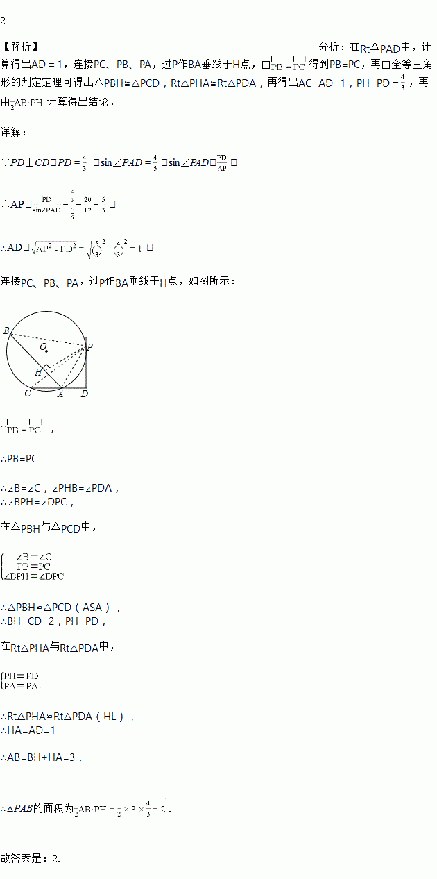 如图,在⊙O中,B,P,A,C是圆上的点,, PD⊥CD,CD交⊙O于A,若AC=AD,PD = ,sin∠PAD = ,则△PAB的面积为_______.