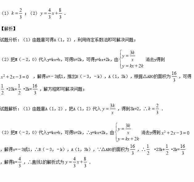 (2)若该反比例函数与过点M(﹣2,0)的直线l:y=kx+b的图象交于A,B两点,如图所示,当△ABO的面积为