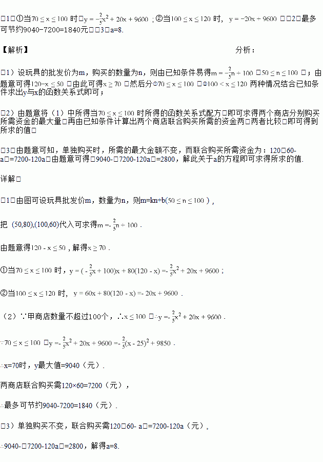 ijÅú·¢²¿Ä³Ò»Íæ¾ß¼Û¸ñÈçͼËùʾ£¬ÏÖÓмס¢ÒÒÁ½¸öÉ̵꣬¼Æ»®ÔÚ¡°ÁùÒ»¡±¶ùͯ½Úǰµ½¸ÃÅú·¢²¿¹ºÂò´ËÀàÍæ¾ß£®Á½É̵êËùÐèÍæ¾ß×ÜÊýΪ120¸ö£¬ÒÒÉ̵êËùÐèÊýÁ¿²»³¬¹ý50¸ö£¬Éè¼×É̵깺Âò¸ö£®Èç¹û¼×¡¢ÒÒÁ½É̵ê·Ö±ð¹ºÂòÍæ¾ß£¬Á½É̵êÐ踶¿î×ܺÍΪyÔª£®![]()