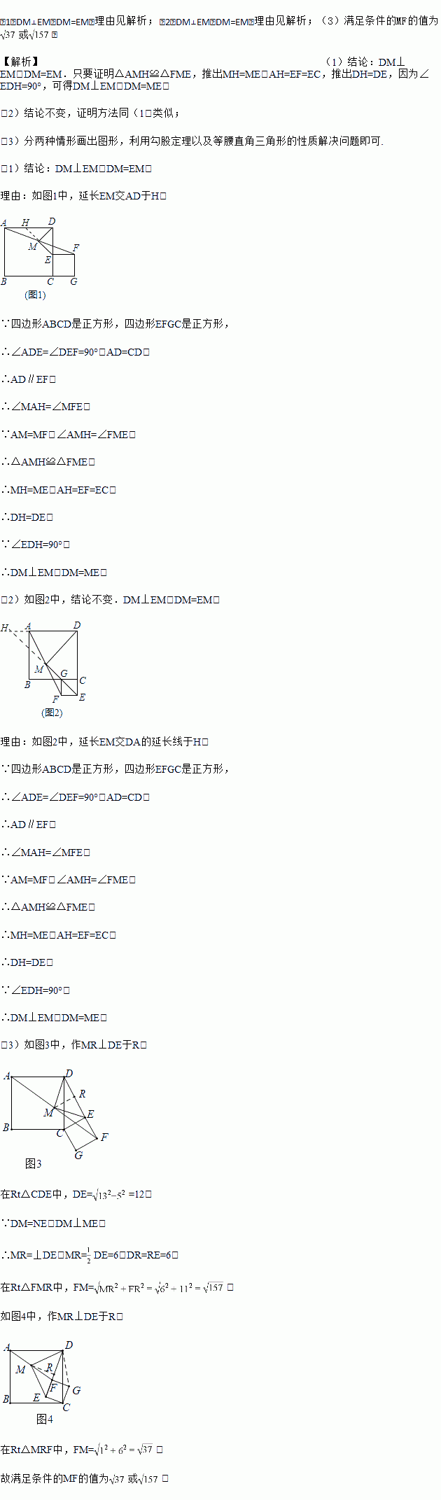 (1)如图1,点E在CD上,点G在BC的延长线上,请判断DM,EM的数量关系与位置关系,并直接写出结论;