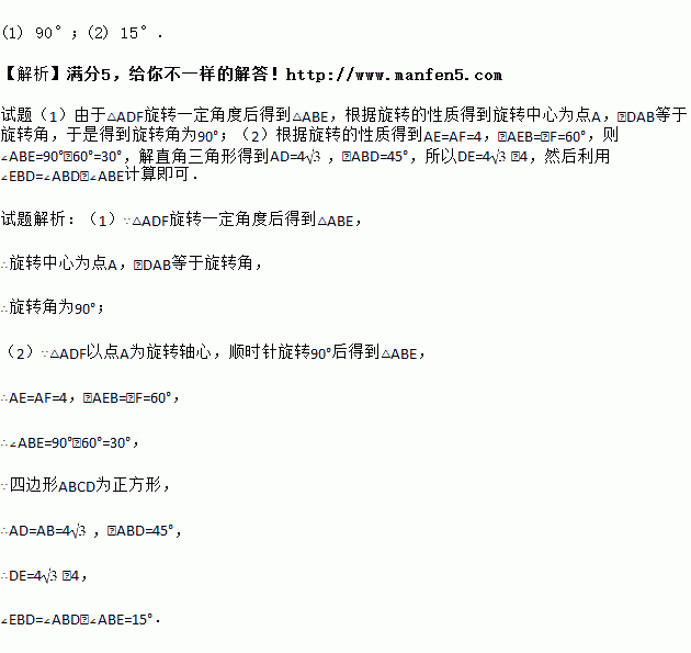 如图,四边形ABCD是正方形,△ADF旋转一定角度后得到△ABE,且点E在线段AD上,若AF=4,∠F=60°.