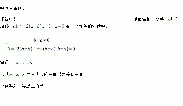 已知关于x的方程(b﹣c)x2+2(a﹣b)x+b﹣a=0有两个相等的实数根,则以a、b、c为三边长的三角形的形状一定是 .