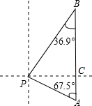 如图某天上午9时,向阳号轮船位于A处,观测到某港口城市P位于轮船的北偏西67.5°,轮船以21海里/时的速度向正北方向行驶,下午2时该船到达B处,这时观测到城市P位于该船的南偏西36.9°方向,求此时轮船所处位置B与城市P的距离?