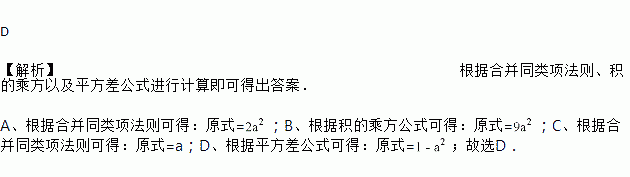 A. a2+a2=a4 B. (3a)2=6a2 C. 4a﹣3a=1 D. (﹣a+1)(a+1)=1﹣a2