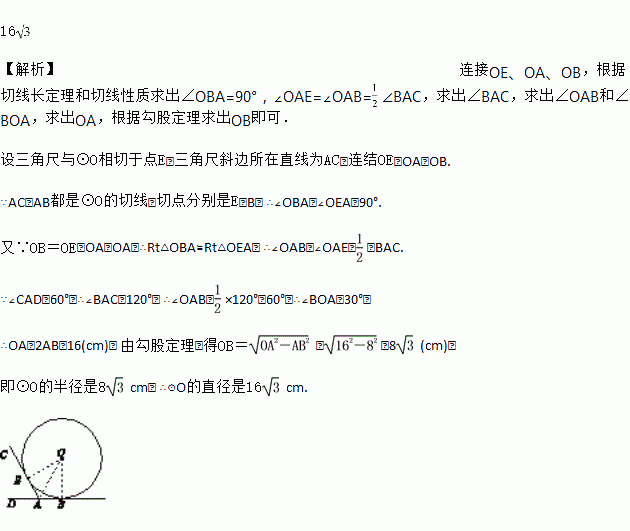 如图,直尺、三角尺都和⊙O相切,B是切点,且AB=8 cm.求⊙O的直径.