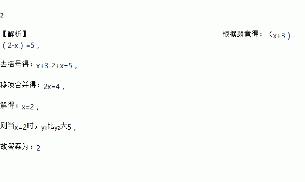 2 【解析】根据题意得:(x+3)-(2-x)=5, 去括号得:x+3-2+x=5, 移项合并得:2x=4, 解得:x=2, 则当x=2时,y1比y2大5, 故答案为:2