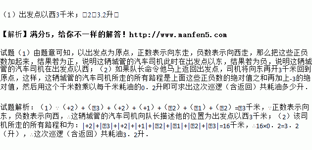 (2)如果队长命令他马上返回出发点,这次巡逻(含返回)共耗油多少升?(已知每千米耗油0.2升)