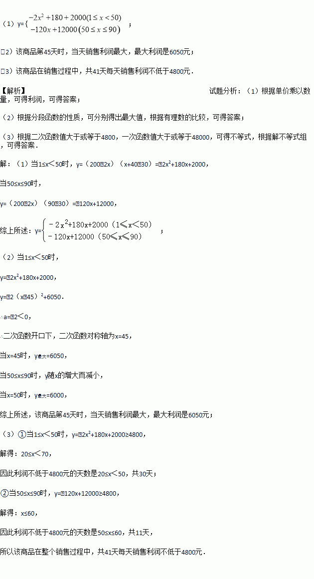 九(1)班数学兴趣小组经过市场调查,整理出某种商品在第x(1≤x≤90)天的售价与销量的相关信息如下表:
