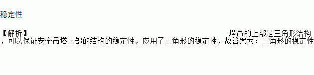 稳定性 【解析】塔吊的上部是三角形结构,可以保证安全吊塔上部的结构的稳定性,应用了三角形的稳定性,故答案为:三角形的稳定性