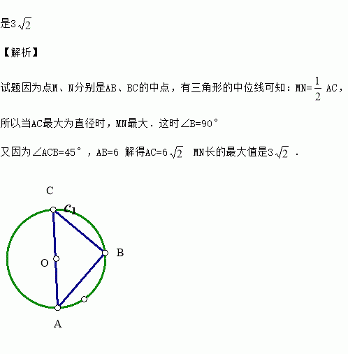 如图,AB为⊙0的弦,AB=6,点C是⊙0上的一个动点,且∠ACB=45°,若点M、N分别是AB、BC的中点,则MN长的最大值是______________。