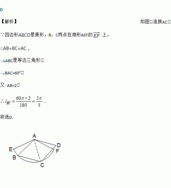 如图,边长为2的菱形ABCD绕点A旋转,当B、C两点恰好落在扇形AEF的弧EF上时,弧BC的长度等于