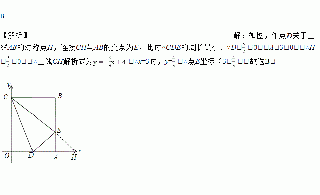 矩形OABC在平面直角坐标系中的位置如图所示,点B的坐标为(3,4),D是OA的中点,点E在AB上,当△CDE的周长最小时,点E的坐标为( )