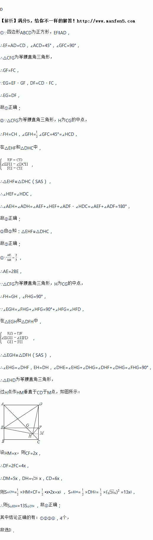 如图,在正方形ABCD中,AC为对角线,E为AB上一点,过点E作EF∥AD,与AC,DC分别交于点G,F,H为CG的中点,连接DE,EH,DH,FH.下列结论中结论正确的有( )