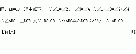如图,已知∠1=∠2,∠3=∠4,AB与CD相等吗?请你说明理由.