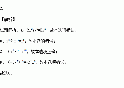 A.2x2·4x2=8x2 B.x5÷x-1=x4 C.(x4)4=x16 D.(-3x2)3=-9x6