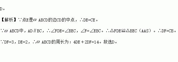 如图,点E是ABCD的边CD的中点,AD、BE的延长线相交于点F,DF=3,DE=2,则ABCD的周长为【 】