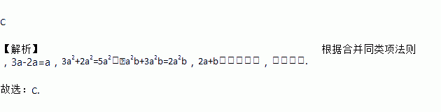 C 【解析】根据合并同类项法则,3a-2a=a,3a2+2a2=5a2,﹣a2b+3a2b=2a2b,2a+b不是同类项,无法计算. 故选:C.