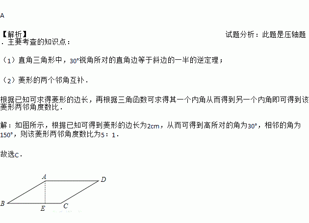 A 【解析】试题分析:此题是压轴题.主要考查的知识点: (1)直角三角形中,30°锐角所对的直角边等于斜边的一半的逆定理; (2)菱形的两个邻角互补. 根据已知可求得菱形的边长,再根据三角函数可求得其一个内角从而得到另一个内角即可得到该菱形两邻角度数比. 【解析】 如图所示,根据已知可得到菱形的边长为2cm,从而可得到高所对的角为30°,相邻的角为150°,则该菱形...