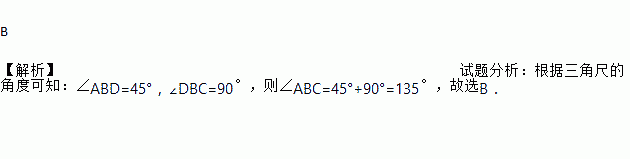 B 【解析】试题分析:根据三角尺的角度可知:∠ABD=45°,∠DBC=90°,则∠ABC=45°+90°=135°,故选B.