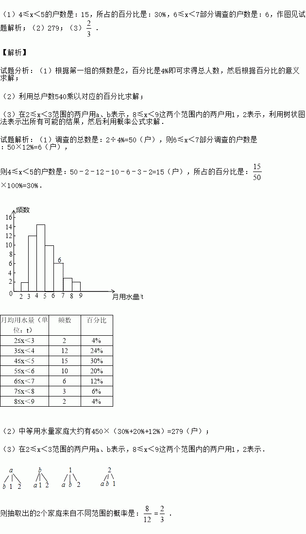 (3)从月均用水量在2≤x<3,8≤x<9这两个范围内的样本家庭中任意抽取2个,求抽取出的2个家庭来自不同范围的概率.