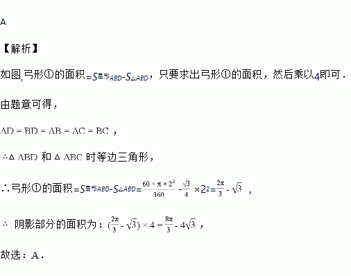 如图,线段,分别以A、B为圆心,以AB的长为半径作弧,两弧交于C、D两点,则阴影部分的面积为