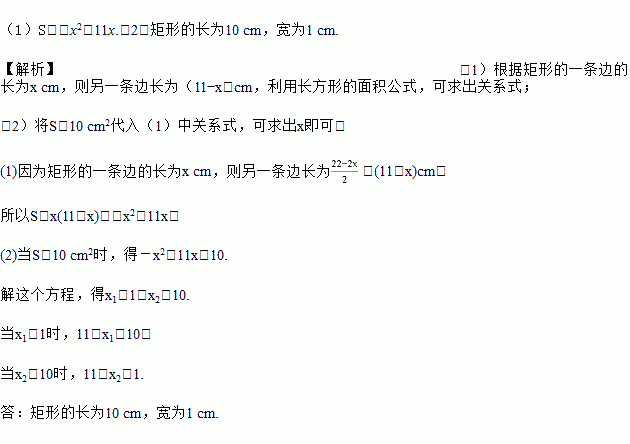 把长为22 cm的金属丝围成一个一条边长为x(cm),面积为S(cm2)的矩形框.