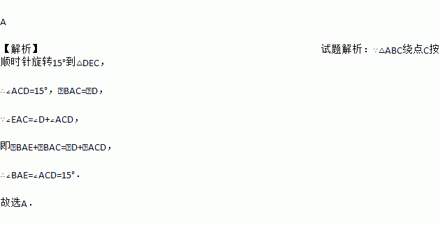 A 【解析】试题解析:∵△ABC绕点C按顺时针旋转15°到△DEC, ∴∠ACD=15°,∠BAC=∠D, ∵∠EAC=∠D+∠ACD, 即∠BAE+∠BAC=∠D+∠ACD, ∴∠BAE=∠ACD=15°. 故选A.