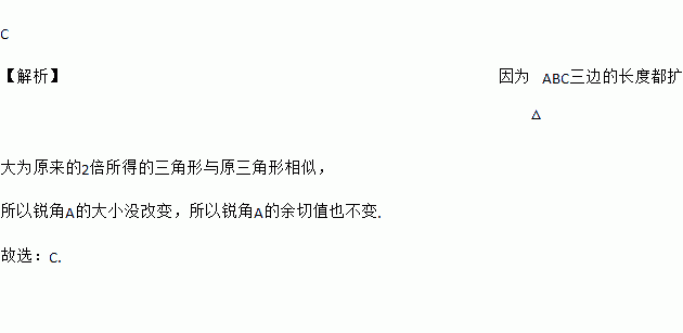 如果把一个锐角三角形三边的长都扩大为原来的两倍,那么锐角A的余切值