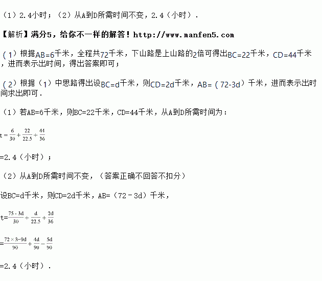 如图,老王开车从A到D,全程共72千米.其中AB段为平地,车速是30千米/小时,BC段为上山路,车速是22.5千米/小时,CD段为下山路,车速是36千米/小时,已知下山路是上山路的2倍.