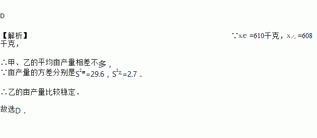某农科所对甲、乙两种小麦各选用10块面积相同的试验田进行种植试验,它们的平均亩产量分别是