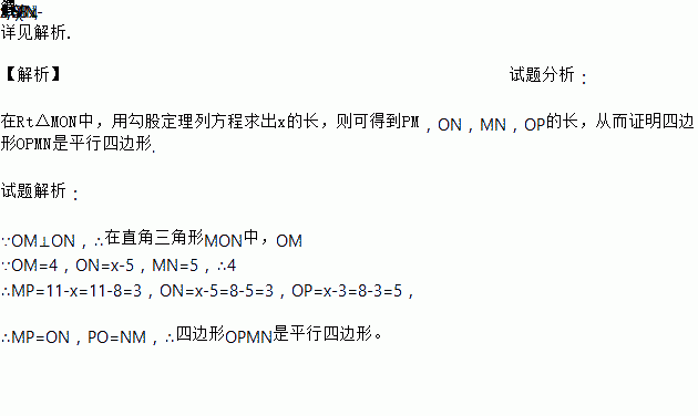 已知,如图OM⊥ON,OP=x-3,OM=4,ON=x-5,MN=5,MP=11-x,求证:四边形OPMN是平行四边形。