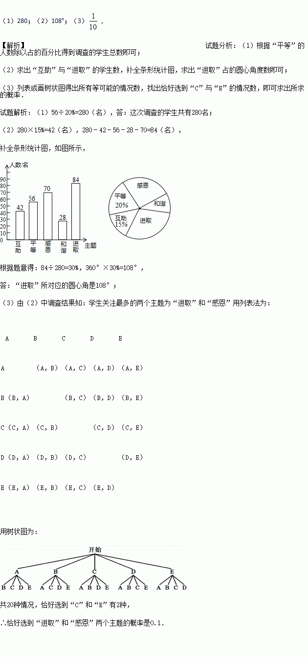 (3)如果要在这5个主题中任选两个进行调查,根据(2)中调查结果,用树状图或列表法,求恰好选到学生关注最多的两个主题的概率(将互助、平等、感恩、和谐、进取依次记为A、B、C、D、E).