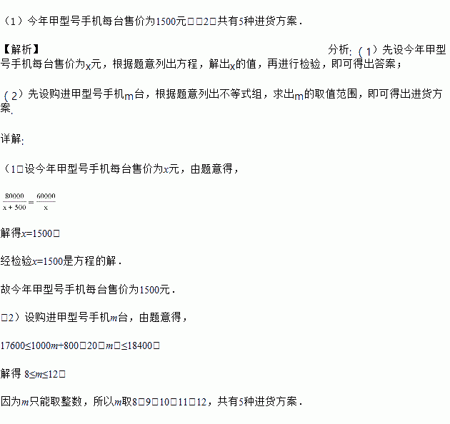 (2)为了提高利润,该店计划购进乙型号手机销售,已知甲型号手机每台进价为1000元,乙型号手机每台进价为800元,预计用不多于1.84万元且不少于1.76万元的资金购进这两种手机共20台,请问有几种进货方案?