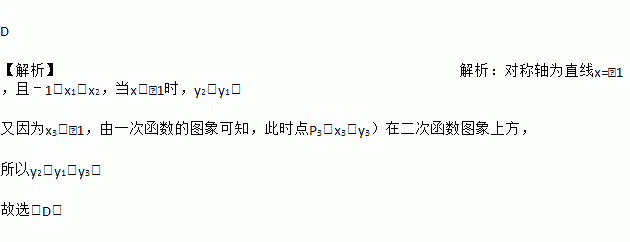 已知抛物线和直线l在同一直角坐标系中的图象如图所示,抛物线的对称轴为直线x=﹣1,P1(x1,y1)、P2(x2,y2)是抛物线上的点,P3(x3,y3)是直线l上的点,且﹣1<x1<x2,x3<﹣1,则y1、y2、y3的大小关系为( )