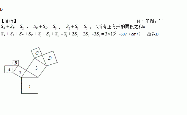 如图,所有的四边形是正方形,所有的三角形都是直角三角形,其中最大的正方形边长为13 cm,则图中所有的正方形的面积之和为()