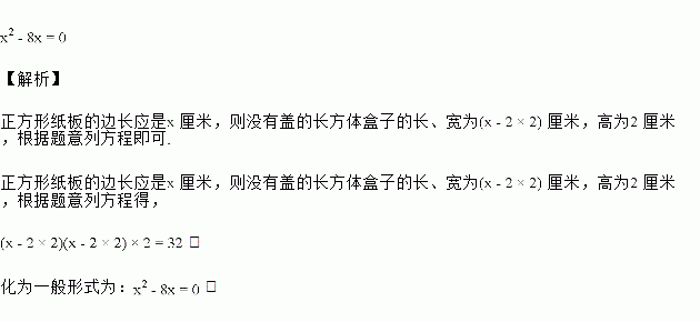 如图,用一块正方形纸板,在四个角上截去四个相同的边长为的小正方形,然后把四边折起来,做成一个没有盖的长方体盒子,使它的容积为.所用的正方形纸板的边长应是多少厘米?如果设正方形纸板的边长是,请列出方程,并把它化成一般形式.