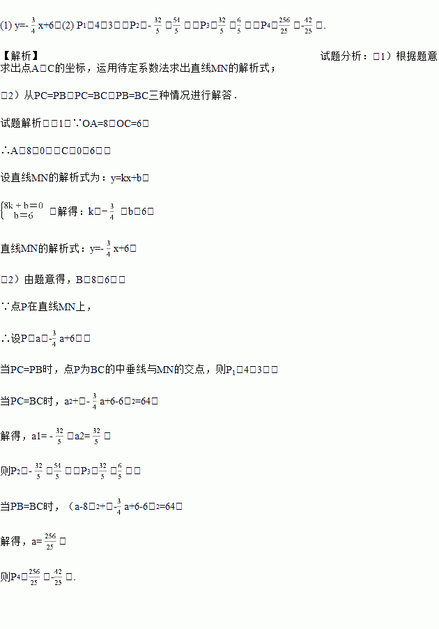 (2)已知在直线MN上存在点P,使△PBC是等腰三角形,求点P的坐标.