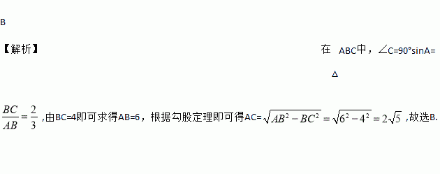 在△ABC中,∠C=90°,BC=4,sinA=,那么AC边的长是( )