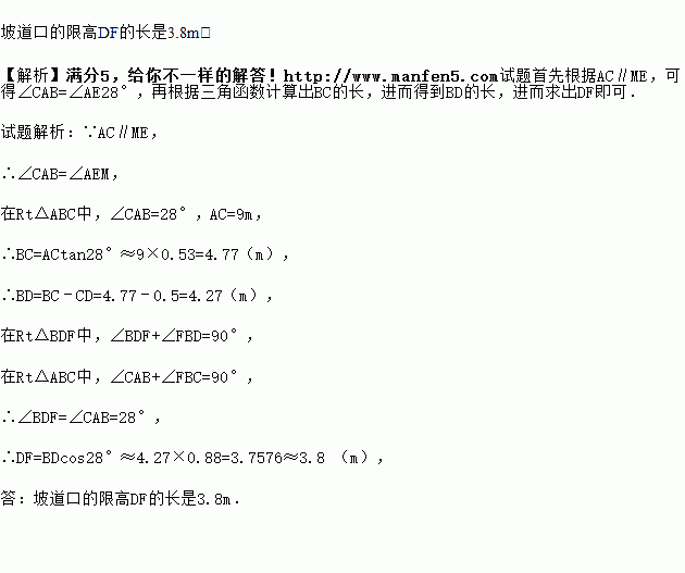 随着人们经济收入的不断提高,汽车已越来越多地进入到各个家庭.某大型超市为缓解停车难问题,建筑设计师提供了楼顶停车场的设计示意图.按规定,停车场坡道口上坡要张贴限高标志,以便告知车辆能否安全驶入.如图,地面所在的直线ME与楼顶所在的直线AC是平行的,CD的厚度为0.5m,求出汽车通过坡道口的限高DF的长(结果精确到0.1m,sin28°≈0.47,cos28°≈0.88,tan28°≈0.53).