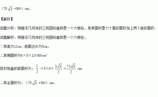 如图是一个上下底密封纸盒的三视图,请你根据图中数据,计算这个密封纸盒的表面积为 cm2.(结果可保留根号)