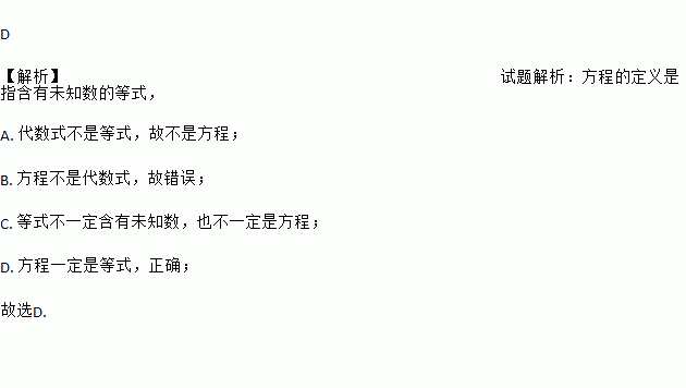A. 代数式是方程 B. 方程是代数式 C. 等式是方程 D. 方程是等式