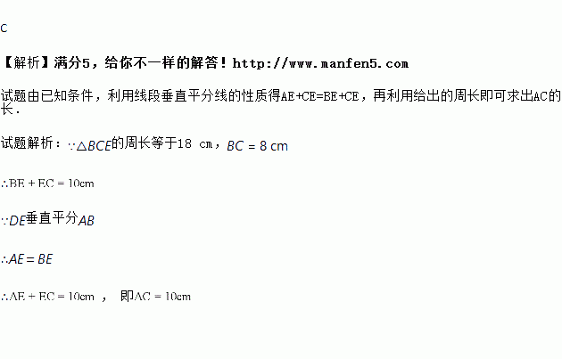 如图,在△ABC中,BC=8,AB的垂直平分线交AB于点D,交AC于点E,△BCE的周长为18,则AC的长等于( )