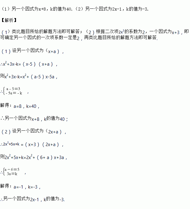 (1)已知二次三项式x2+3x-k有一个因式是x-5,求另一个因式及k的值;