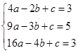 解析试题分析:若二次函数y=ax2+bx+c的x与y的部分对应值如下表,根据表中数据我们选择三组数据,分别为-2、3,-3、5,-4、3列出式子为