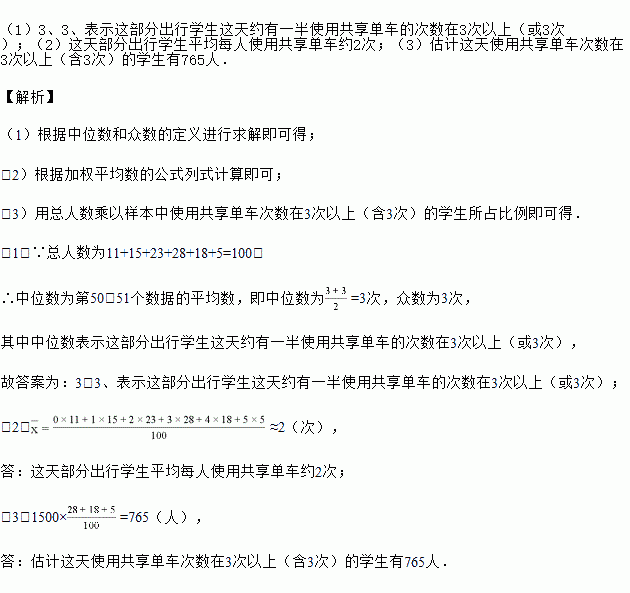 (3)若该校某天有1500名学生出行,请你估计这天使用共享单车次数在3次以上(含3次)的学生有多少人?