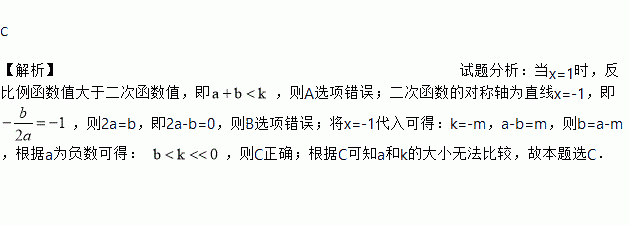 C 【解析】试题分析:当x=1时,反比例函数值大于二次函数值,即,则A选项错误;二次函数的对称轴为直线x=-1,即,则2a=b,即2a-b=0,则B选项错误;将x=-1代入可得:k=-m,a-b=m,则b=a-m,根据a为负数可得: ,则C正确;根据C可知a和k的大小无法比较,故本题选C.