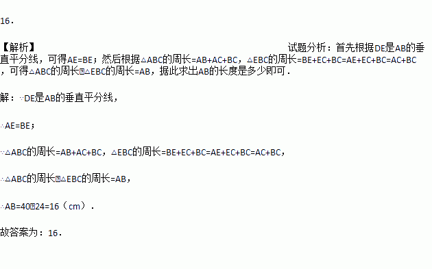 如图,△ABC中,AB=AC,AB的垂直平分线交边AB于D点,交边AC于E点,若△ABC与△EBC的周长分别是40cm,24cm,则AB=__cm.