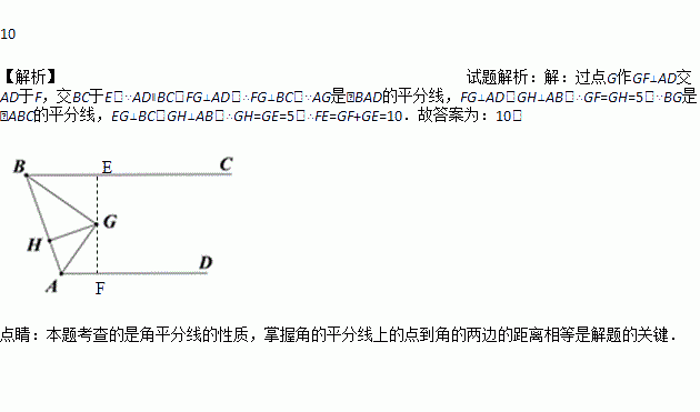 如图,AD∥BC,BG,AG分别平分∠ABC与∠BAD,GH⊥AB,HG=5,则AD与BC之间的距离是___.