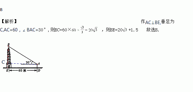 小强和小明去测量一座古塔的高度(如图),他们在离古塔60m的A处,用测角仪器测得塔顶的仰角为30°,已知测角仪器高AD=1.5m,则古塔BE的高为( )